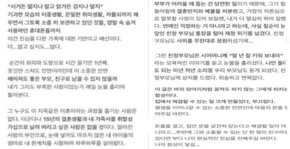 "그 누구도 이 지옥 같은 이혼이라는 과정을 즐기는 사람은 없다. 더군다나 15년의 결혼생활과 내 가족사를 휘발성 가십으로 날려 버리고 싶은 사람은 없을 것이다. 알려진 사람의 부인으로, 눈에 넣어도 아프지 않은 내 아이들의 엄마로 내 한계치를 시험하며 하루하루를 살아왔다"